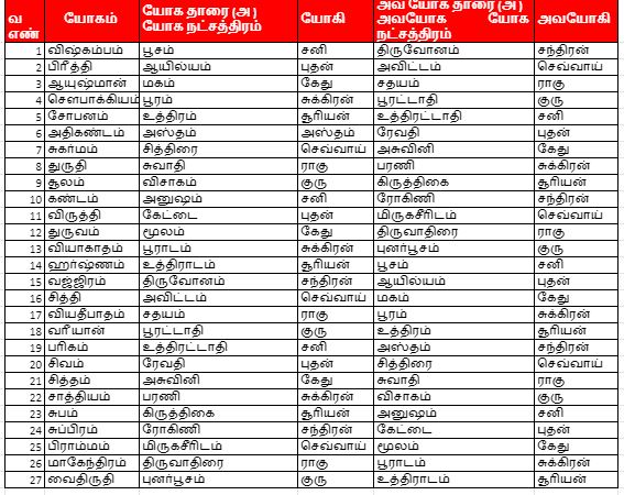 ஒருவர் பிரீதி நாம யோகத்தில் பிறந்து இருந்தால் அவருக்கு யோக தாரை ஆயில்ய நட்சத்திரம் ஆகும். அந்த ஆயில்ய நட்சத்திரத்தில் அவர் மனைவி பிறந்திருந்தால் அவர் மனைவி வந்தபின் நல்ல யோகங்கள் ஏற்படும். ஆக யோக கிரகத்தின் ஆதிபத்தியம் காரகத்துவம் சிறப்பான யோகத்தைச் செய்யும். அதே போல் அவயோக தாரையில் உள்ள கிரகம் அதன் தன்மைக்கு ஏற்றவாறு கெடு பலன்களைச் செய்யும